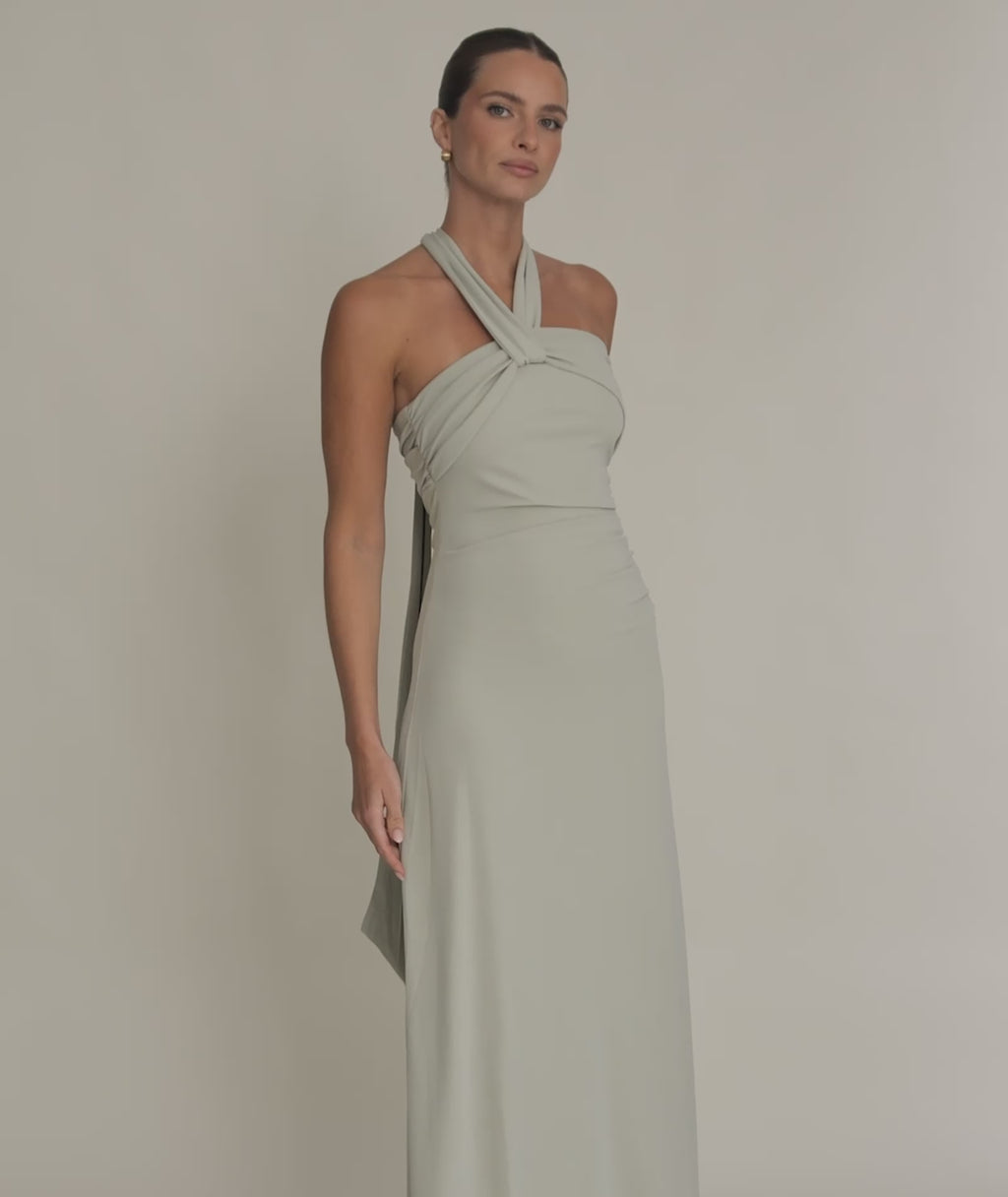 In Soft Sage, the ARIELLE gown is the perfect balance of delicate asymmetric neckline and flattering ruched body. This sculpting stretch fabric creates a refined hourglass silhouette, making it the ultimate choice for modern elegance. Strapless-bra friendly, timeless, and chic.