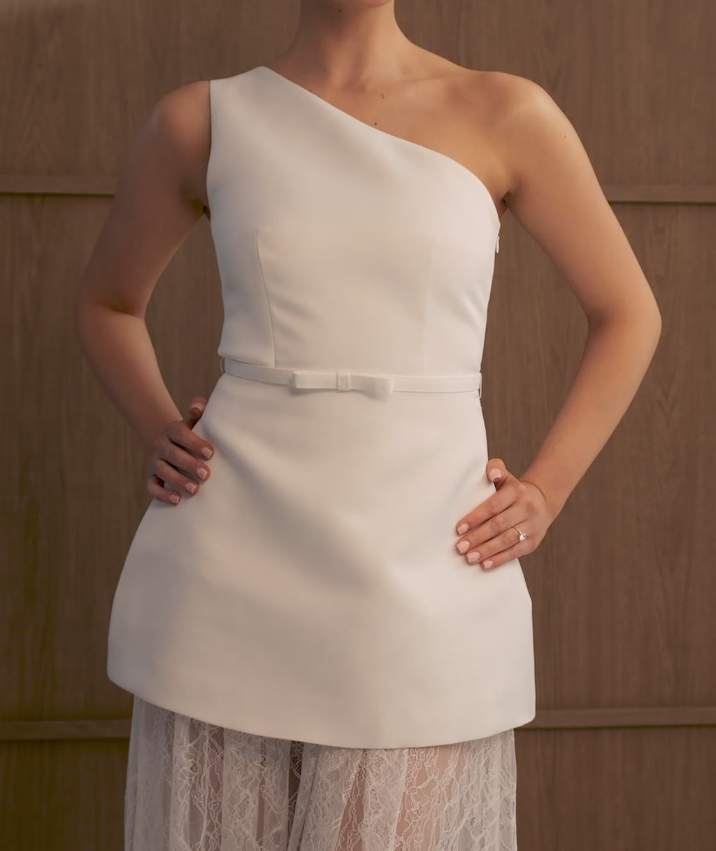 Designed for contemporary bridal moments, this statement silhouette pairs a sleek tulip-style satin mini with a soft, romantic lace maxi overlay. The flowing lace maxi skirt adds texture and drama, striking the perfect balance between playful and refined - ideal for civil ceremonies, rehearsal dinners or a standout bridal after-party look.