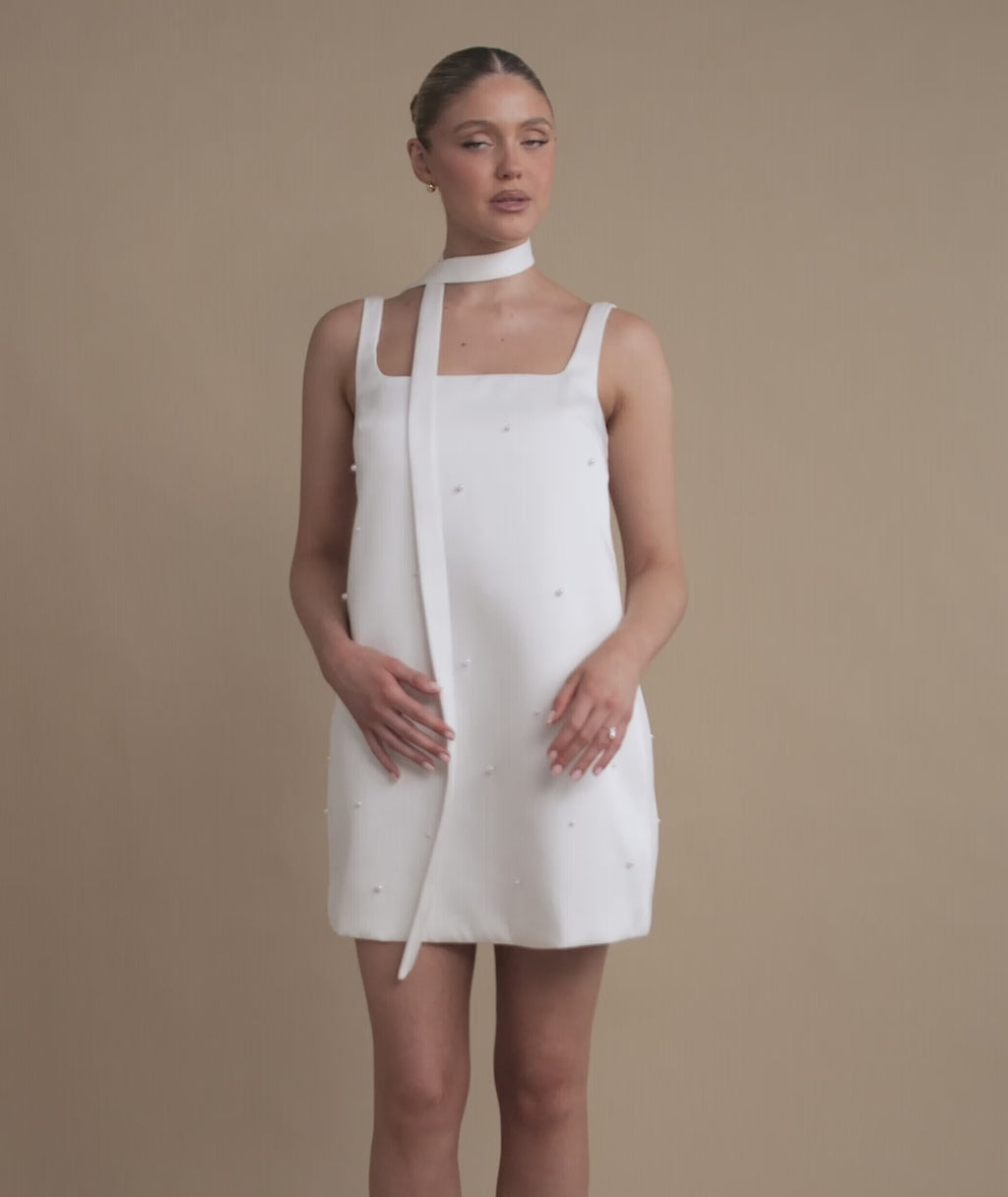 The ANYA Pearl Scatter Mini Dress is your elevated bridal mini. With a clean square neckline, delicate pearl detailing, and a matching neck scarf, it’s designed to feel modern, minimal, and just a little bit iconic. Perfect for courthouse wedding, after-parties, and everything in between.